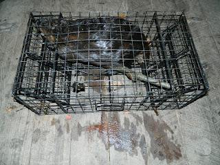 This is a picture of a 45 pound beaver taken today in 32 inch long 12×18 double powered door cage trap on the first attempt and in all likelihood a first for a double door trap this short. The trap was set upside down in 30 inches of water on the bottom in a stream channel with the powered doors lifting the beaver up and into the trap. Time will tell if this was a fluke or the norm and just how short double door traps can be made.