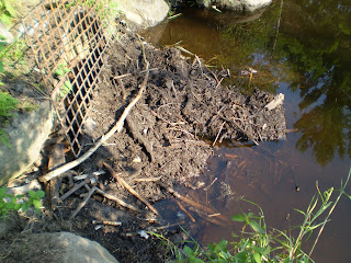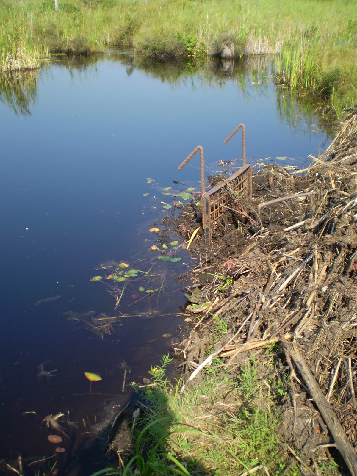 | The culvert above was plugged wtih a mud dam. Mud dams are conducive to using The Comstock Beaver Cages, which can be placed in front of the dam with a small trickle of water passing through the trap. Even a small leak in the dam will attract a beaver. The traps are set in single door mode, upside down, with the upper end of the cage resting against the dam. It is the closed door, of course, that is again the dam. The lower end of the trap with the opened door is placed towards the pond, resting just below the surface. Road fabric is used to cover the entire cage, even past the closed door right up to the dam. Loose muck is then packed on top of the cage to conceal all of the fabric. The trap will lie at a slight angle, raised perhaps a couple of inches at the closed door, leaving an air space. |