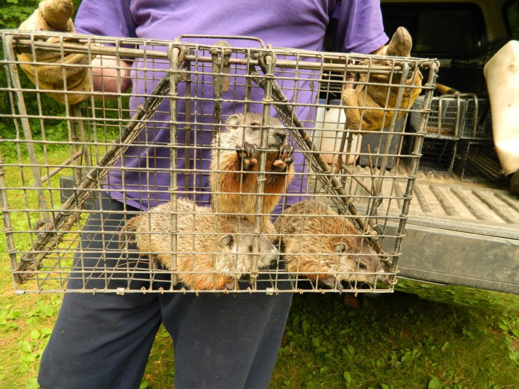 The large Swim Through Comstock Beaver Cage Traps take beavers of all sizes. Pictured are six beaver, three adults weighing