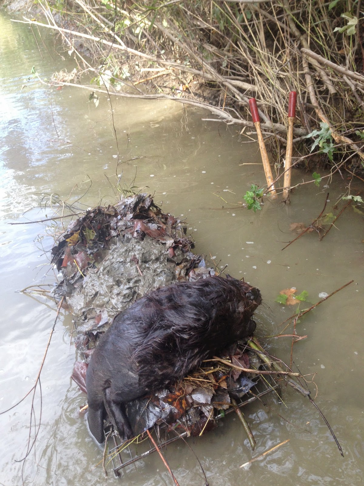 Tim from Ohio shared his success with this beaver in a castor mound used using a 12x18x39 Comstock Beaver Cage Trap buried under a pile of leaves and mud. Credit must be given to Dan Gates in Colorado for coming up with this set. The set was designed to be used in open water where there are no channels, small streams or narrow spots to place a cage in standard blind sets. When there is shallow open water with basically nothing to work with, Dan simply placed the trap about even with the water level, then piled it with leaves first, then mud and topped it off with some castor. This simple yet ingenious set works on the principle that a beaver will just swim around and dive under until he satisfies his curiosity about the “intruder.” Before the beaver has done enough sniffing and looking, the beaver swims around and simply goes through the trap, as shown by Tim on his first shot at making this set.